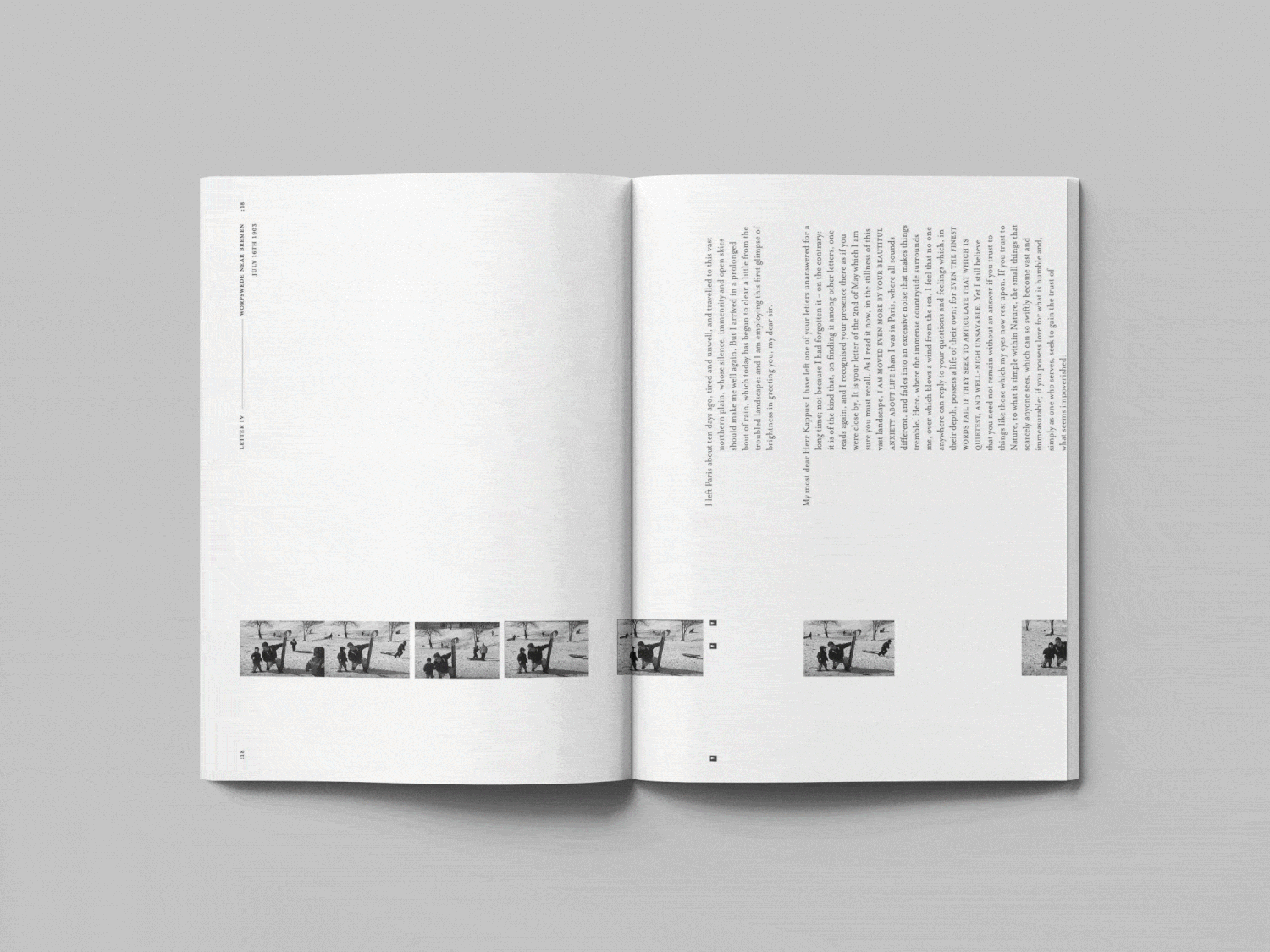 This curated publication takes letters written by poet, Rainer Maria Rilke, and pairs them with experimental imagery. The copy is set at a 90-degree angle, forcing readers to turn the publication in order to read the text. This creates a vertical viewing experience, similar to reading a letter, separate from the horizontal one. Sequenced stills from my VHS home videos create an effect of passing time. These spreads are broken up with famous works of art overlaid with scans of my childhood drawings. The masterful fine art compared to the childish strokes of my early drawings bring a playful tone to the weighty themes of the text.