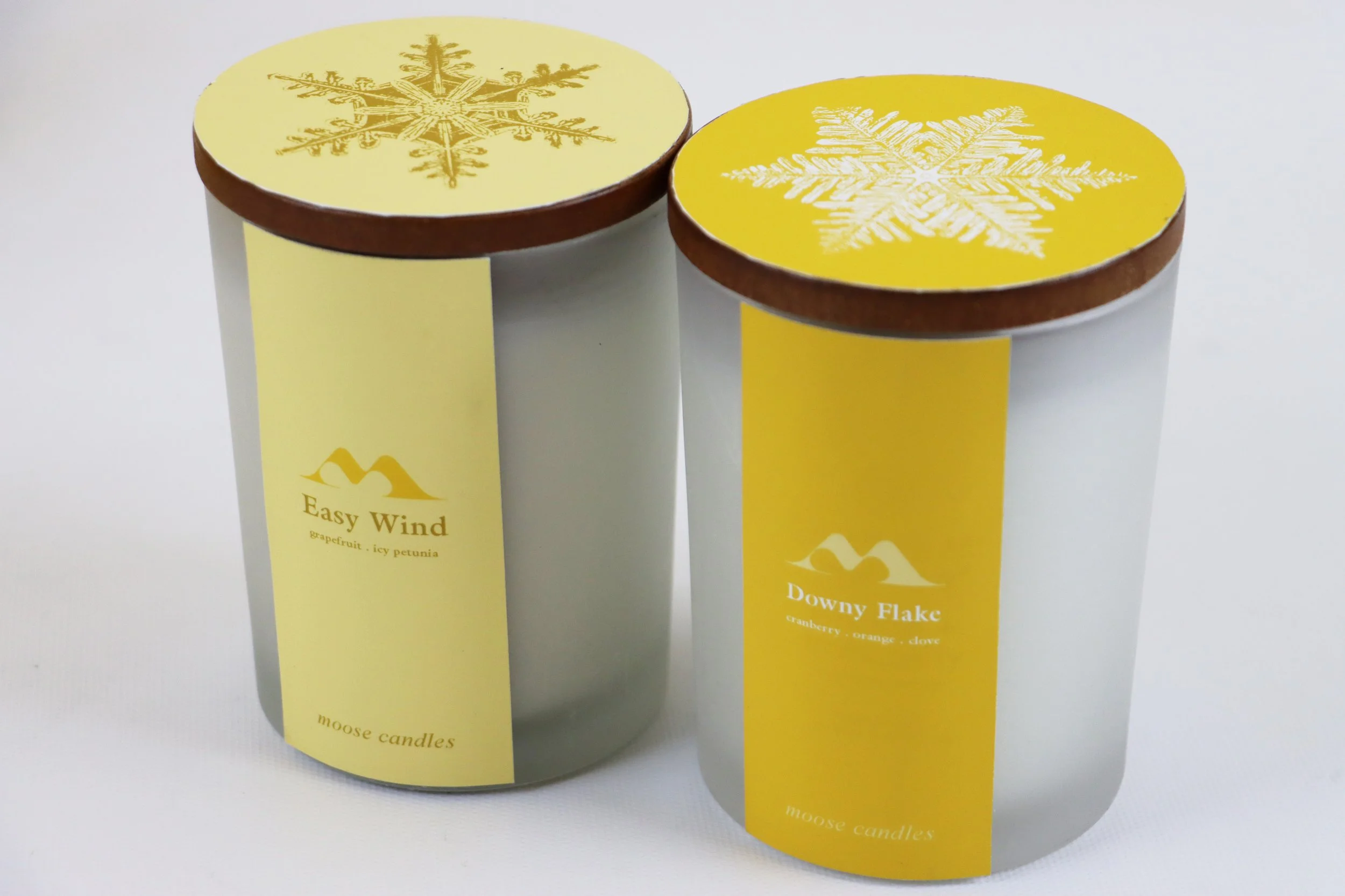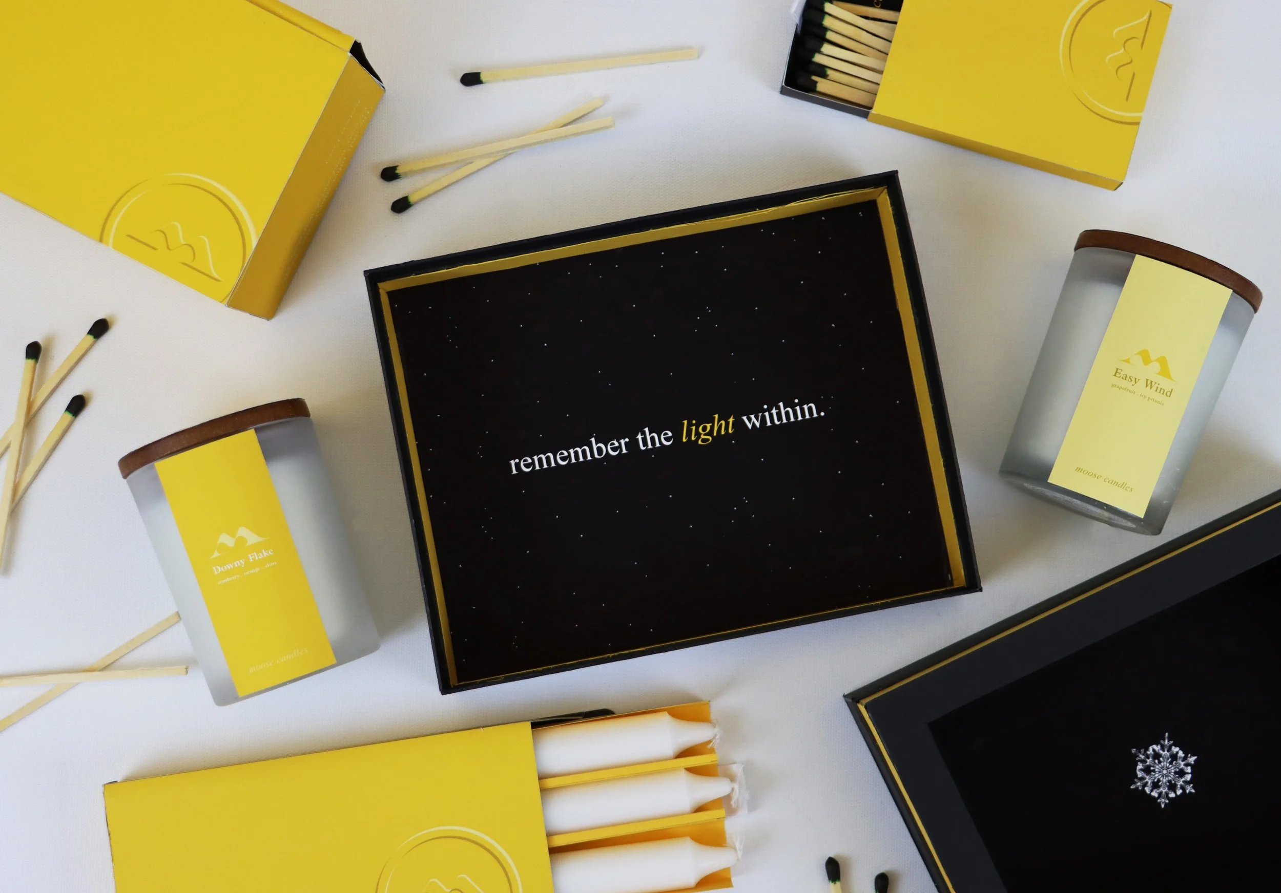 The winter months can be very difficult for me. That’s why I made this winter candle gift box to remind myself, and others, that there’s always hope and something beautiful to find in darkness. Included in this kit are two jar candles, three taper candles, matches, and a wick trimmer. The outside of this box represents the cold, dark, snowy months of winter. The microscopic images of snowflakes come from Wilson Bentley’s studies in the late 1800s. He discovered that no two snowflakes are alike. Once the package is opened, a golden yellow envelops viewers, as if they are entering the warm inside of a cabin or home. The copywriting inspires winter joy and warmth rather than sadness. The names of the two candles “Easy Wind” and “Downy Flake” come from Robert Frost’s poem “Stopping by Woods on a Snowy Evening.”